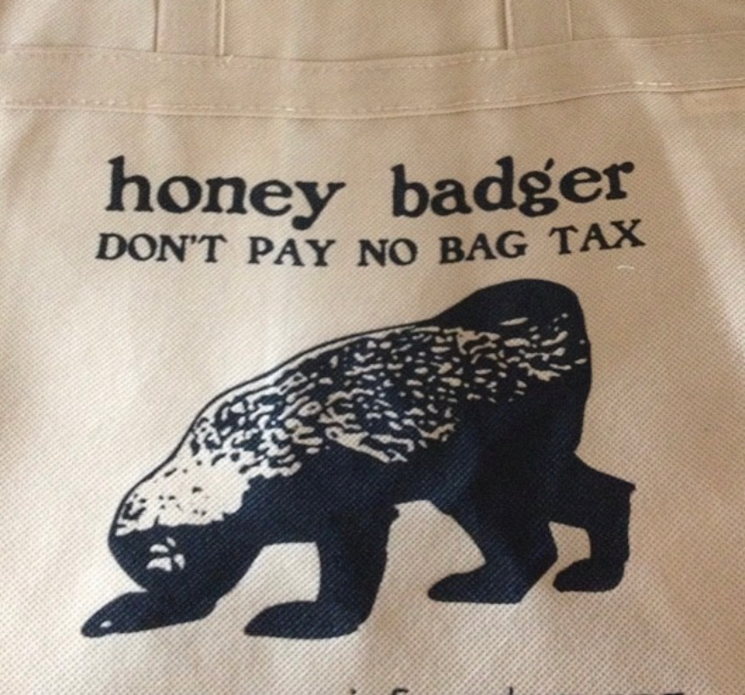 If I’m the one doing the buying, I grab only what I can carry without using a bag. Under the circumstances, I’m much more willing to shove items into my pockets and to walk away with overladen arms. Honey badger don’t pay no bag tax.