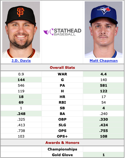 Chapman’s defensive prowess cannot be ignored. Last season, the Giants were the worst team defensively, logging 117 errors. While Davis contributed to that total with 9 errors of his own, his numbers do not look all that different from Chapman’s (who won his fourth gold glove last season). Chapman recorded 12 errors across 1214 innings at third base (300 more than Davis, who also spent 30 games between first base and DH) and .968 FPCT. Davis had a .967 FPCT at third base and although he clocks in below Chapman on the “range factor” metric, he made strides in the field last season and proved to be a capable defensive third baseman.